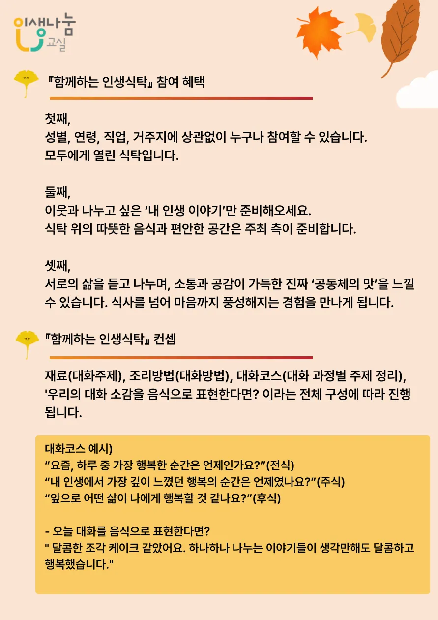 함께하는 인생식탁을 통해 지역 사회와 개인들이 더 깊은 관계를 맺고 상호작용하는 환경을 만들고자 합니다.