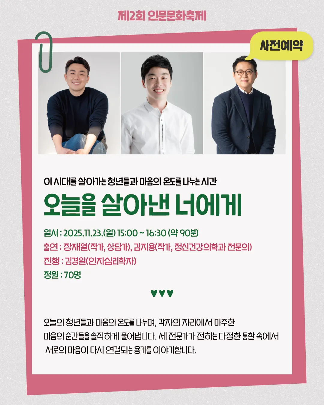 일시|11.23.(일) 15:00 ~ 16:30 (약 90분) 출연|장재열(작가, 상담가), 김지용(작가, 정신건강의학과 전문의) 진행|김경일(인지심리학자)