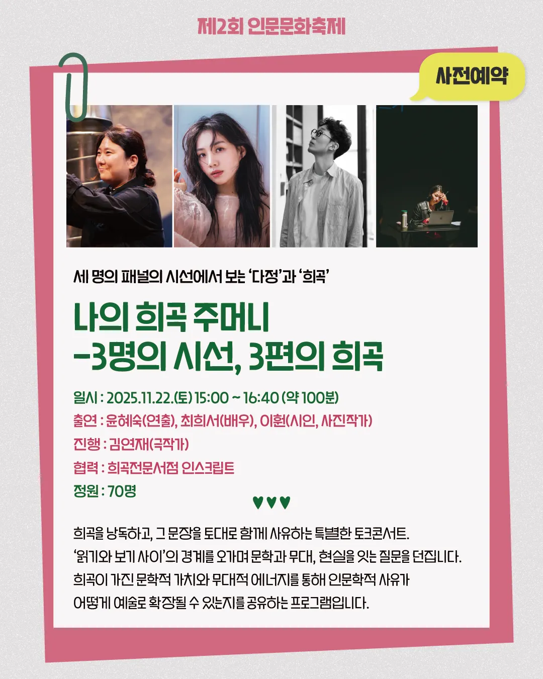 일시|11.22.(토) 15:00 ~ 16:40 (100분) 출연|윤혜숙(연출), 최희서(배우), 이훤(시인, 사진작가) 진행|김연재(극작가) 협력|희곡전문서점 인스크립트