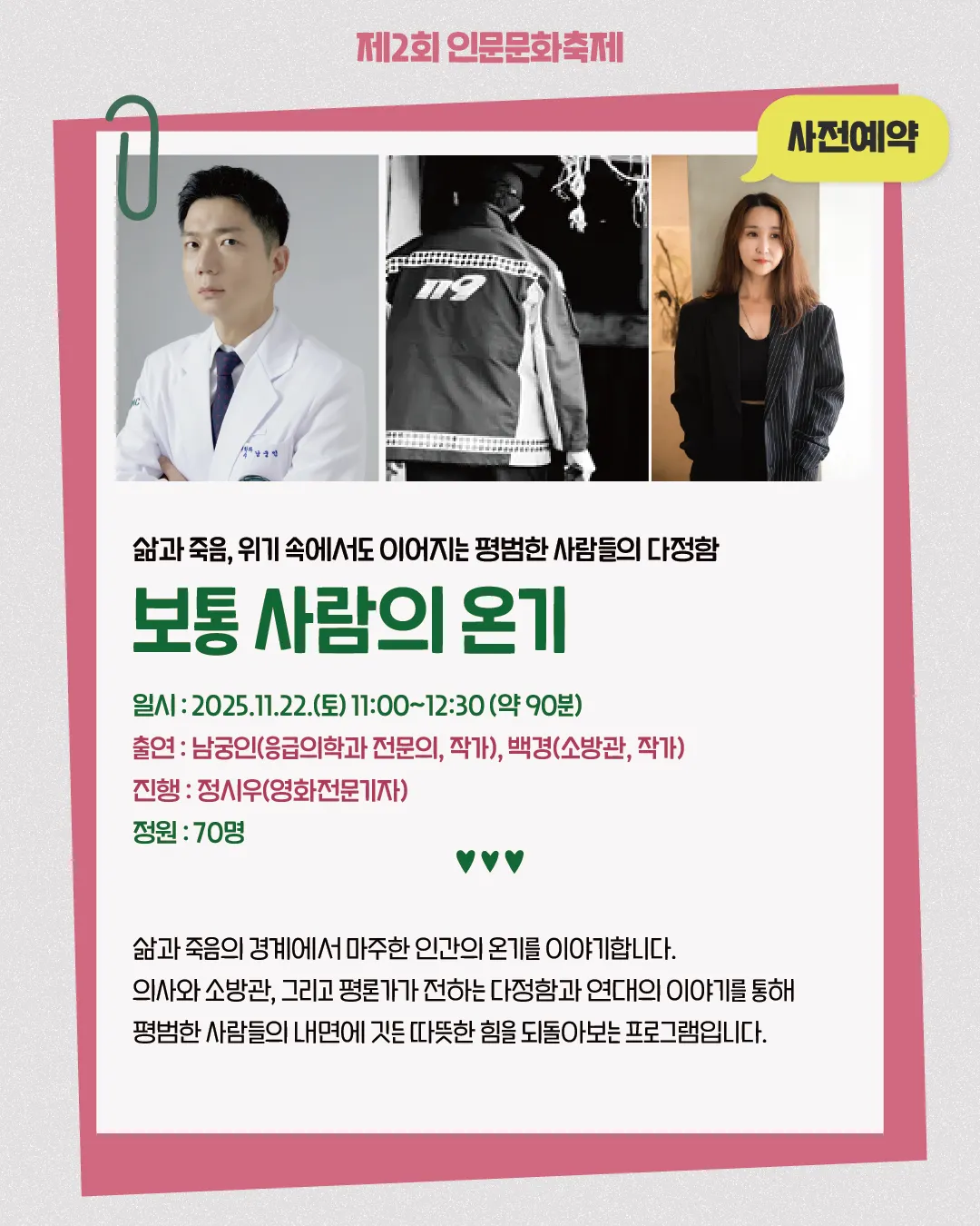 일시|11.22.(토) 11:00~12:30 (약 90분) 출연|남궁인(응급의학과 전문의, 작가), 백경(소방관, 작가) 진행|정시우(영화전문기자)