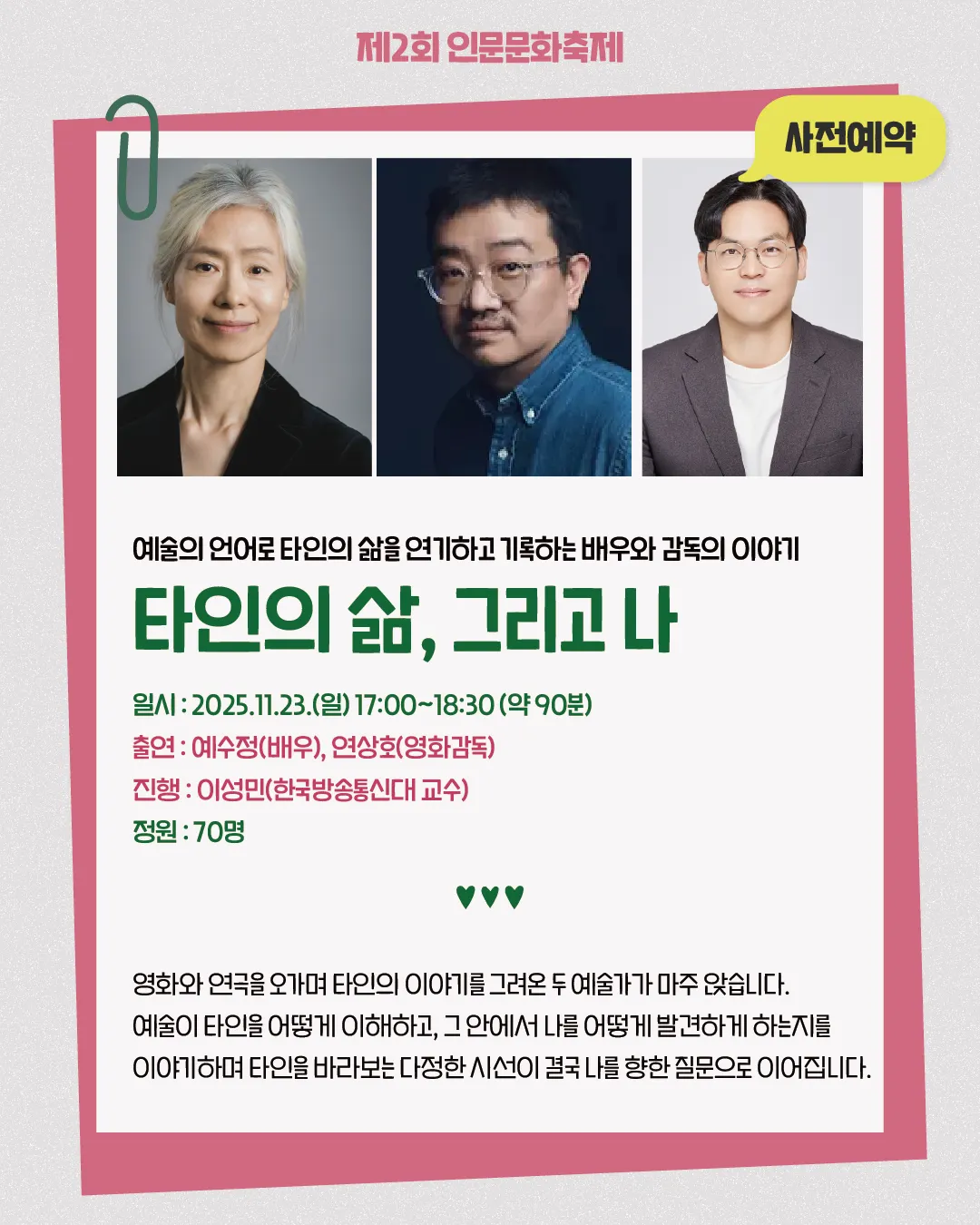 일시|11.23.(일) 17:00~18:30 (약 90분) 출연|예수정(배우), 연상호(영화감독) 진행|이성민(한국방송통신대 교수)