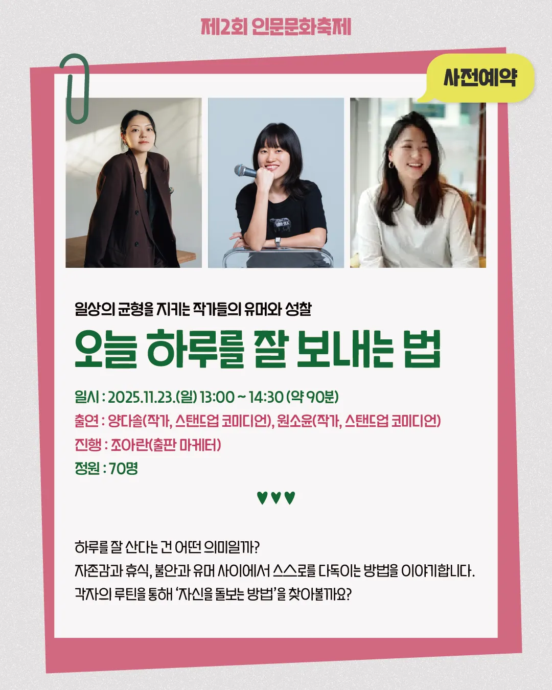 일시|11.23.(일) 13:00 ~ 14:30 (약 90분) 출연|양다솔(작가, 스탠드업 코미디언), 원소윤(작가, 스탠드업 코미디언) 진행|조아란(출판 마케터)